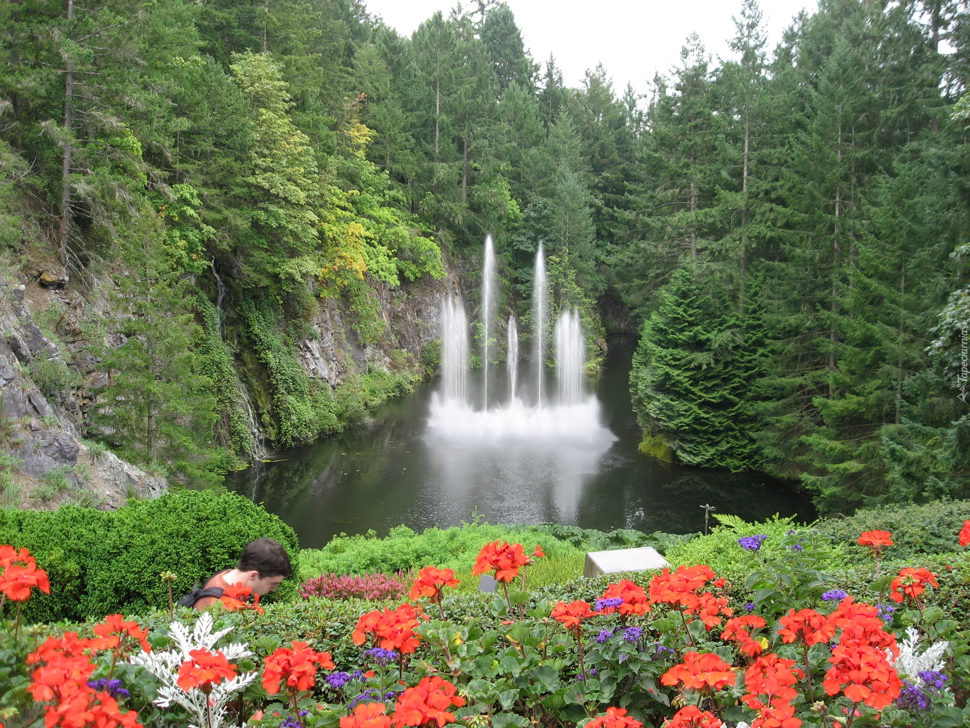 Edytor tapety: Fontanna, Jeziorko, Las, Kwiaty
