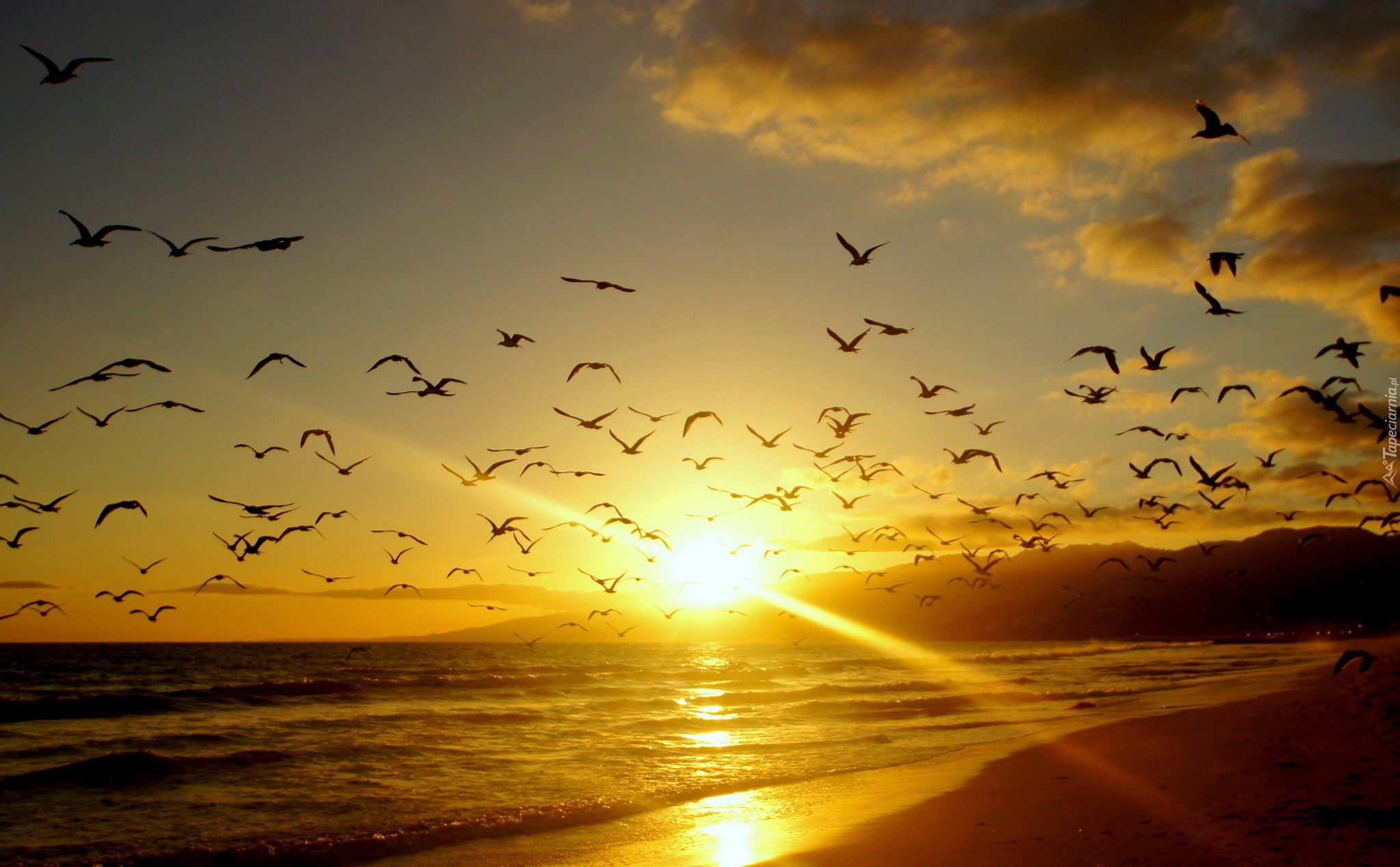 Edytor tapety: Zachód, Słońca, Morze, Ptaki