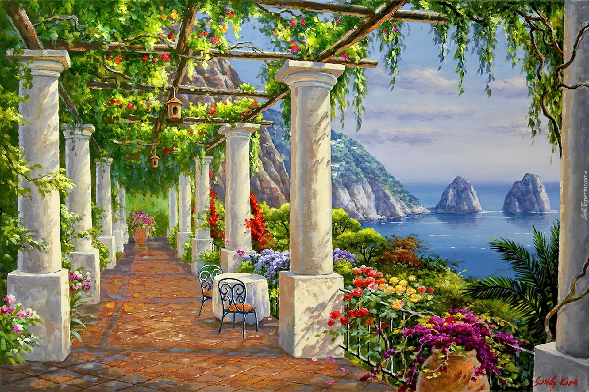 Edytor tapety: Taras, Kolumny, Widok, Morze, Góry