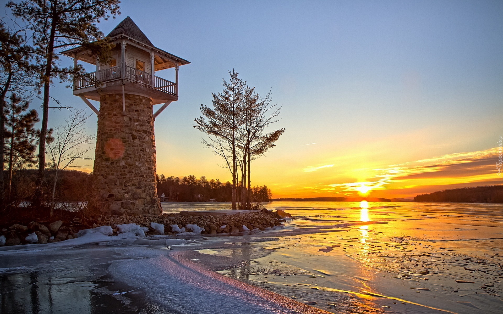 Edytor tapety: Jezioro, Zachód, Słońca, Wieża