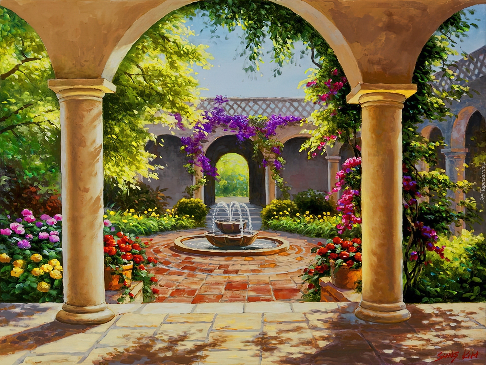 Edytor tapety: Taras, Ogród, Fontanna, Kwiaty