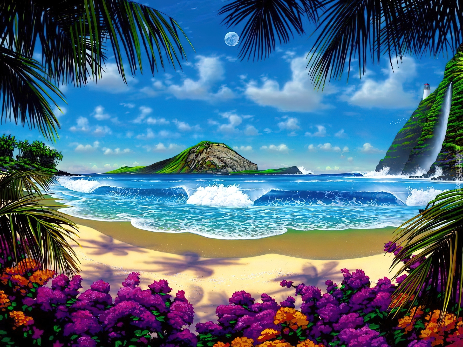Edytor tapety: Morze, Plaża, Skały, Kwiaty, Palmy
