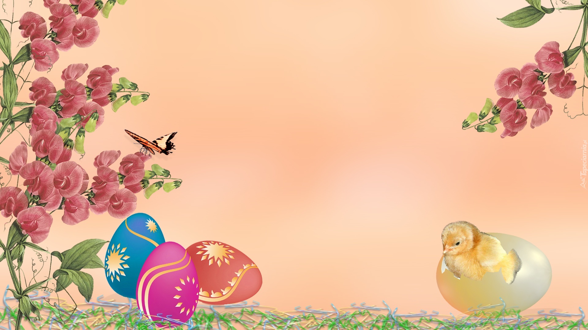 Edytor tapety: Kurczaczek, Jajka, Kwiaty, Wielkanoc