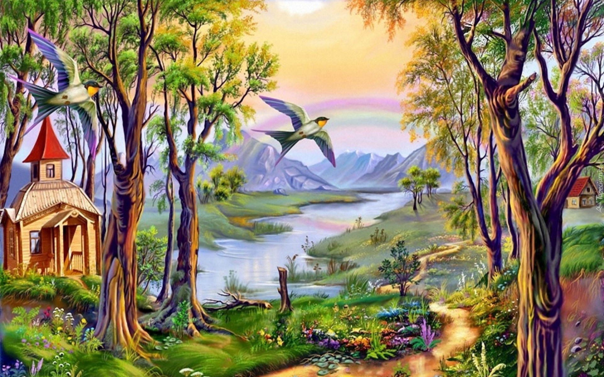Edytor tapety: Kapliczka, Dróżka, Rzeka, Jaskółki