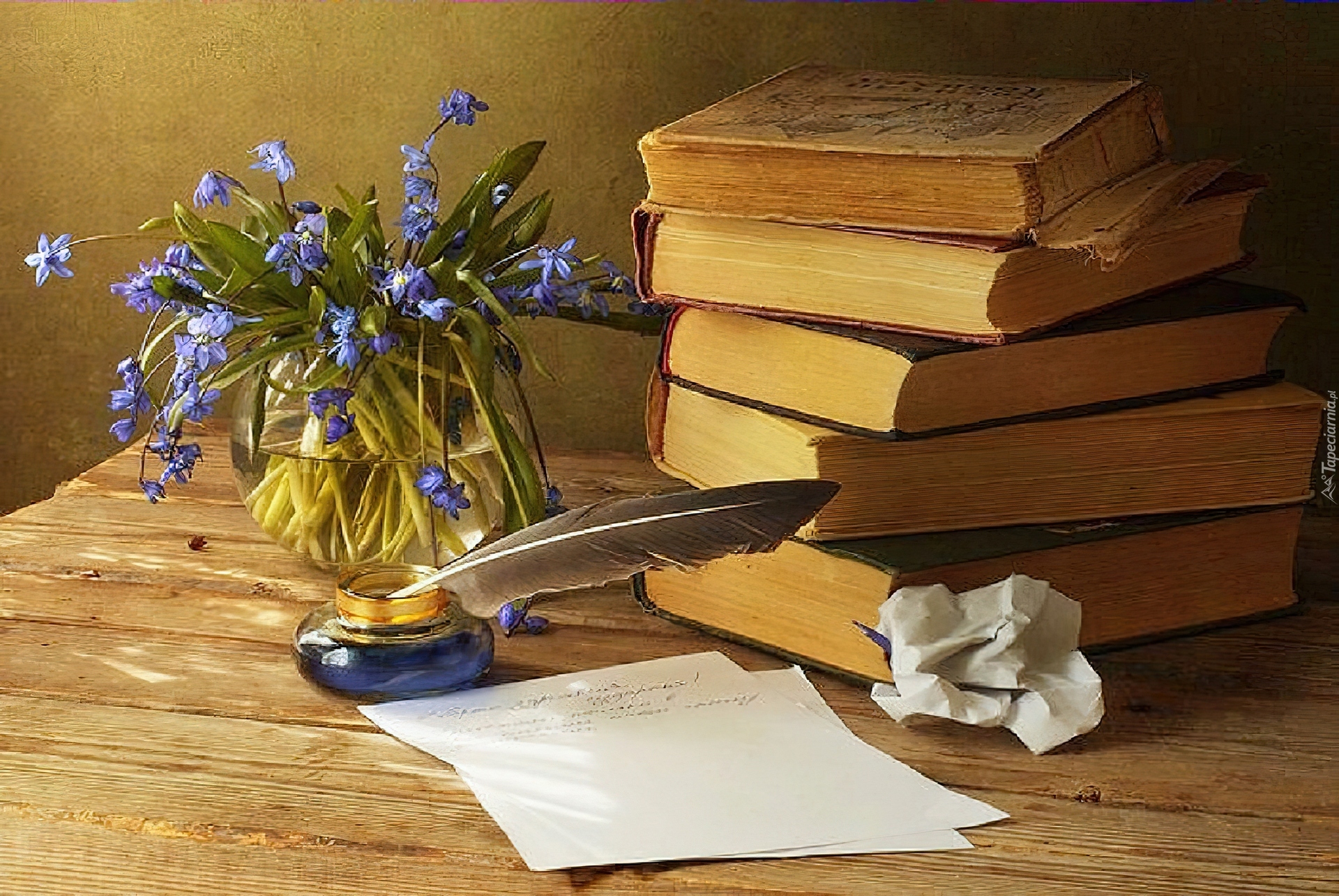 Edytor tapety: Książki, Kałamarz, Pióro, Wazonik, Kwiatki