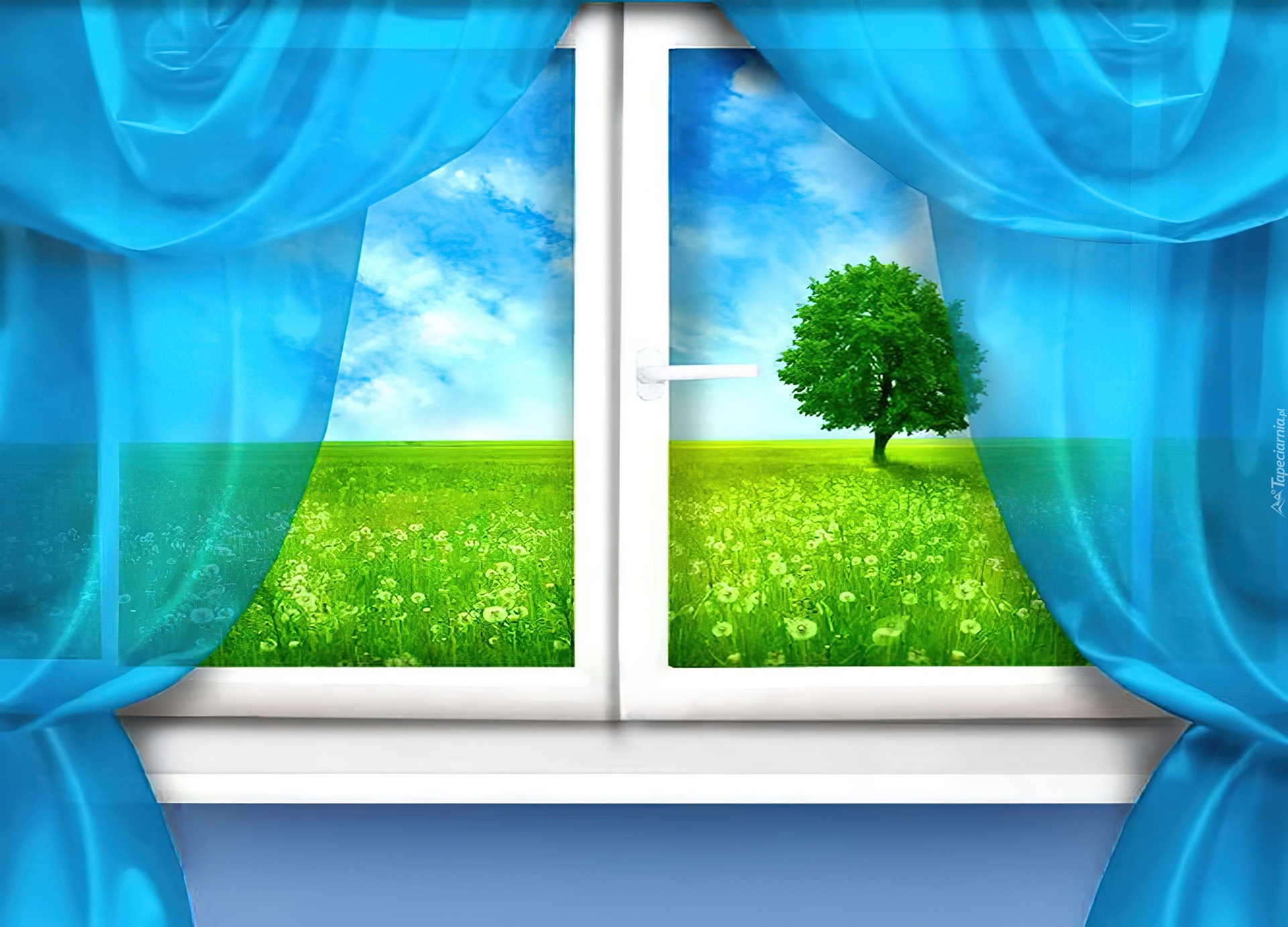 Edytor tapety: Okno, Łąka, Drzewo, Niebieskie, Zasłony