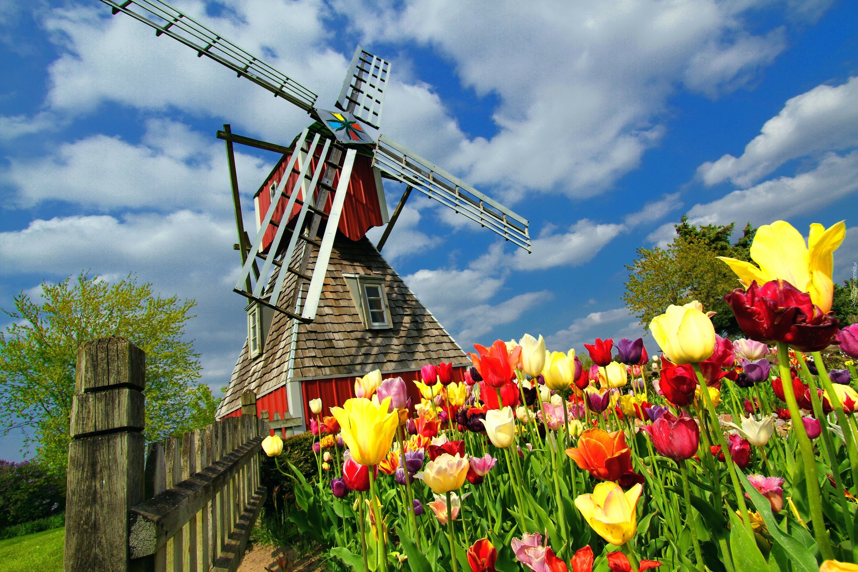 Edytor tapety: Wiatrak, Płot, Pole, Tulipany