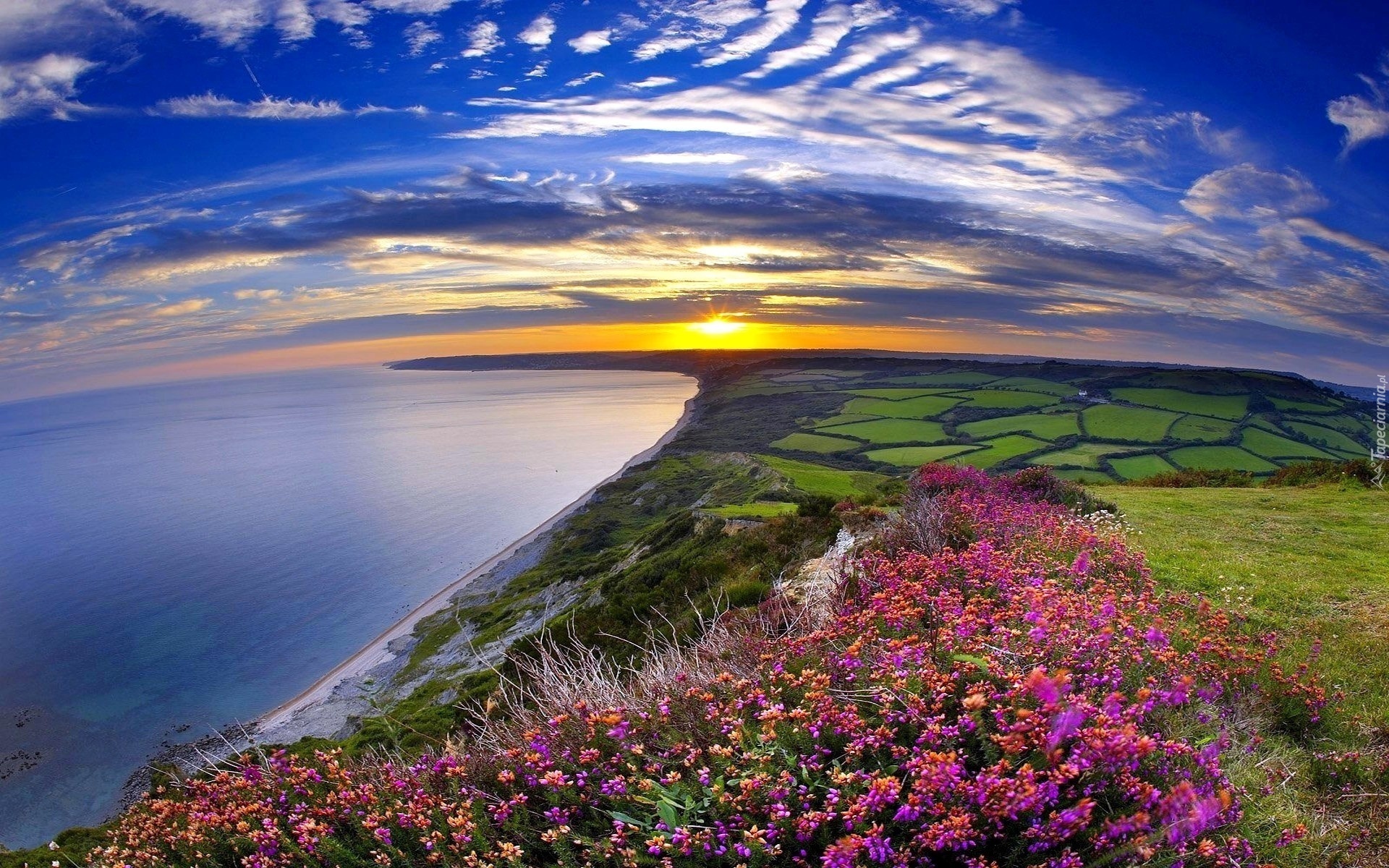 Edytor tapety: Zachód, Słońca, Pola, Morze, Kwiaty