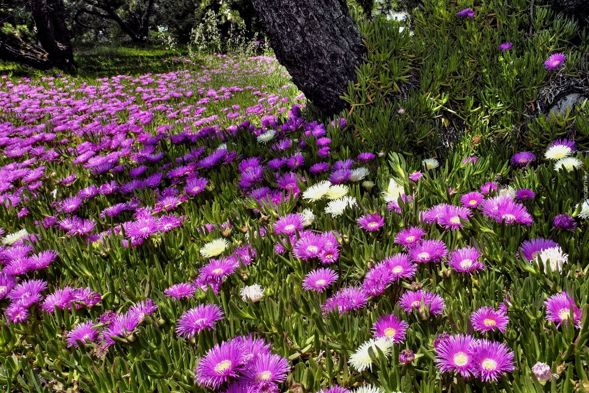 Edytor tapety: Łąka, Fioletowe, Kwiaty, Pień, Drzewa