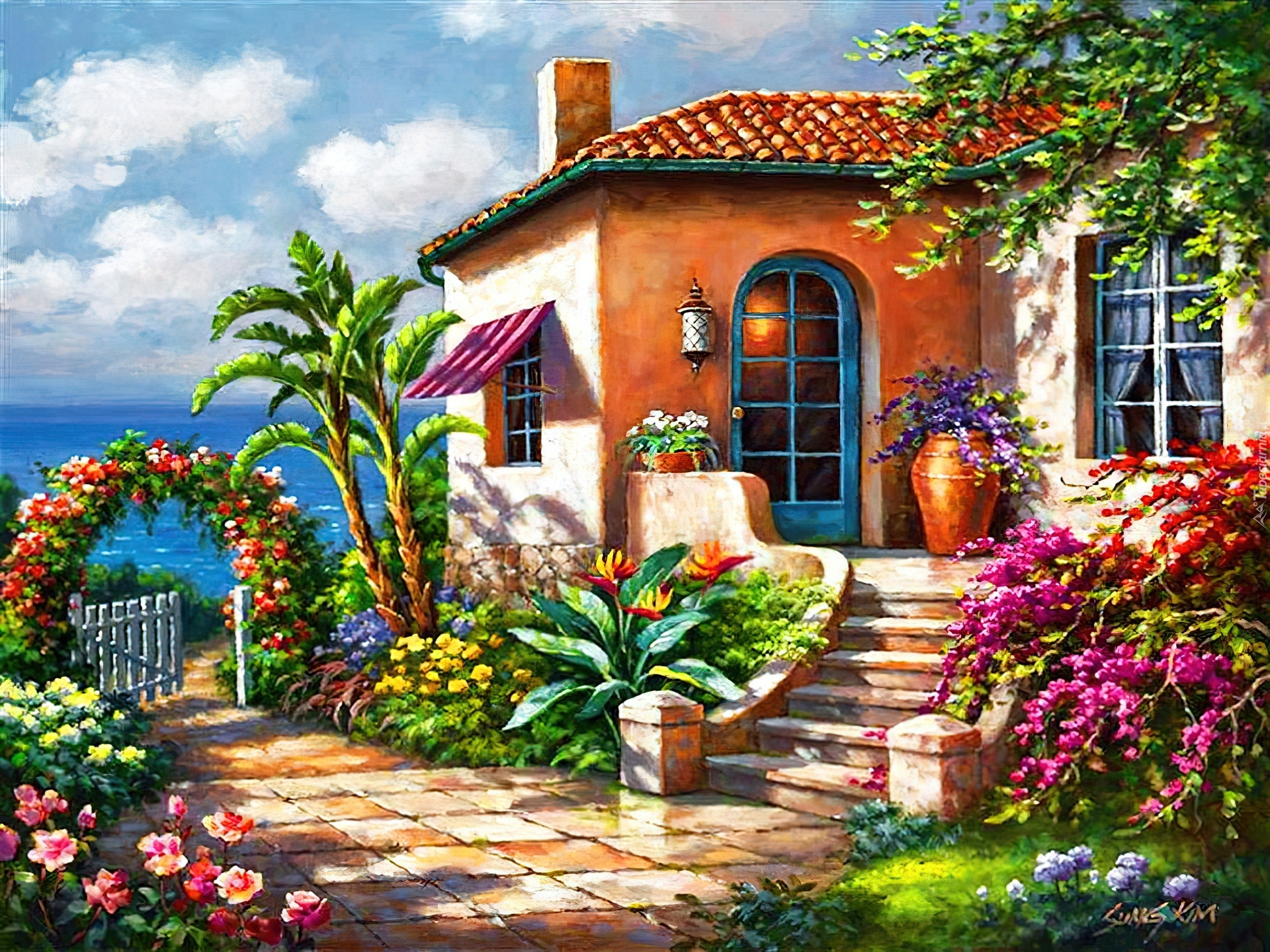 Edytor tapety: Dom, Ogród, Widok, Morze, Kwiaty, Schody, Bramka