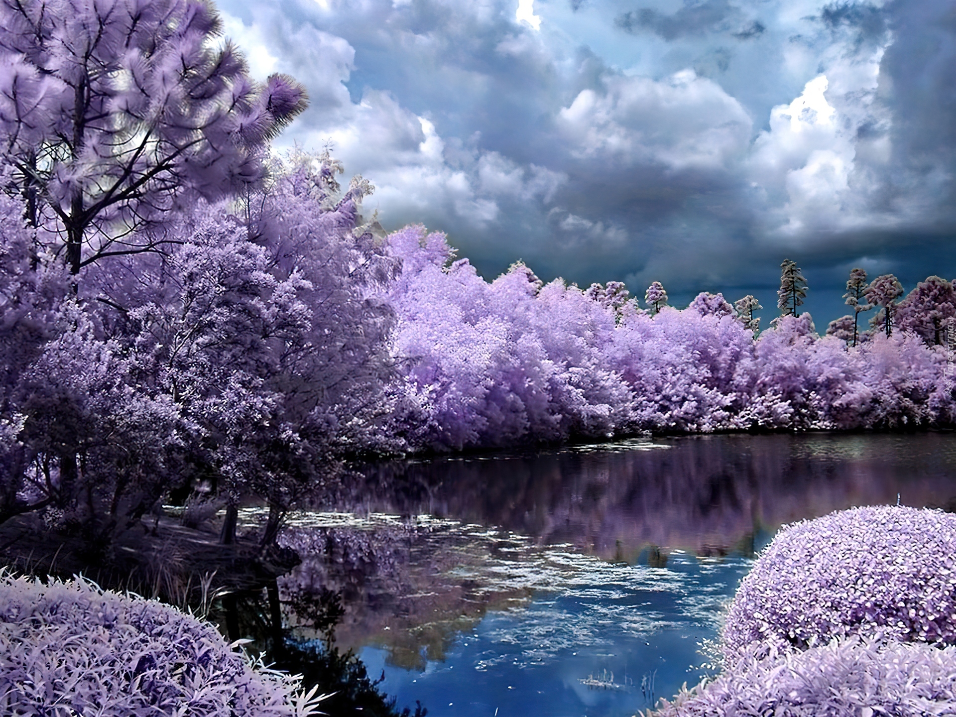 Edytor tapety: Rzeka, Kwitnące, Drzewa, Zachmurzone, Niebo, Odbicie