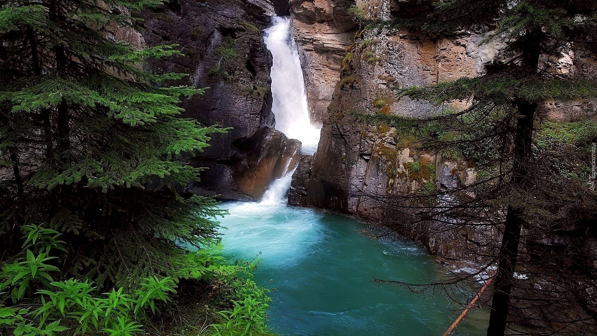 Edytor tapety: Wodospad, Skały, Las