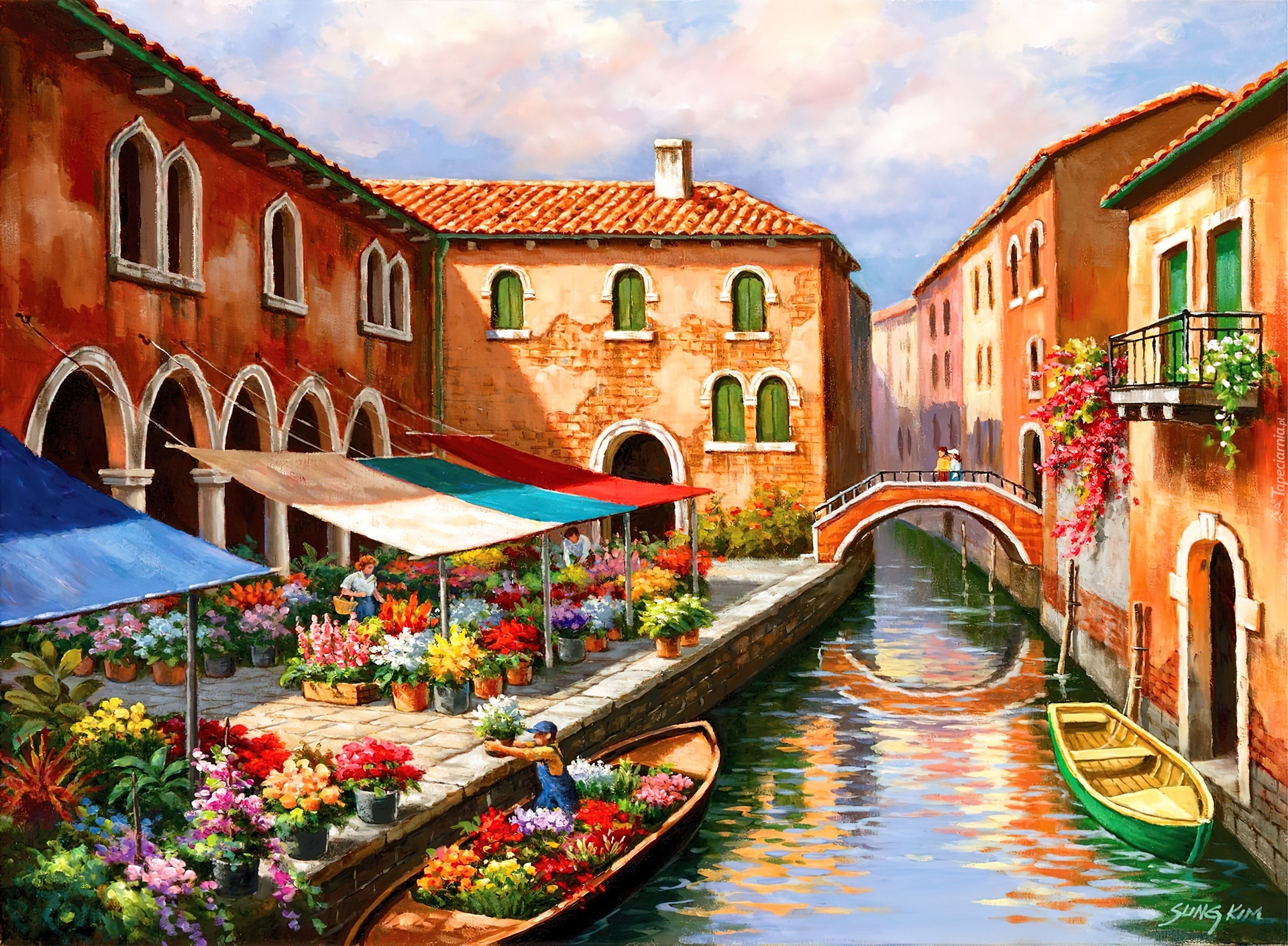 Edytor tapety: Wenecja, Ulica, Kanał, Domy, Łódki, Kwiaty