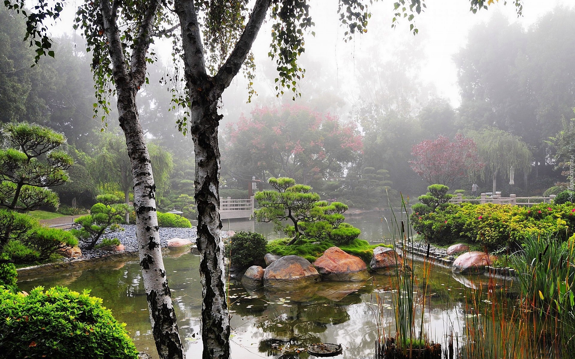 Edytor tapety: Japoński, Ogród, Poranek, Mgła