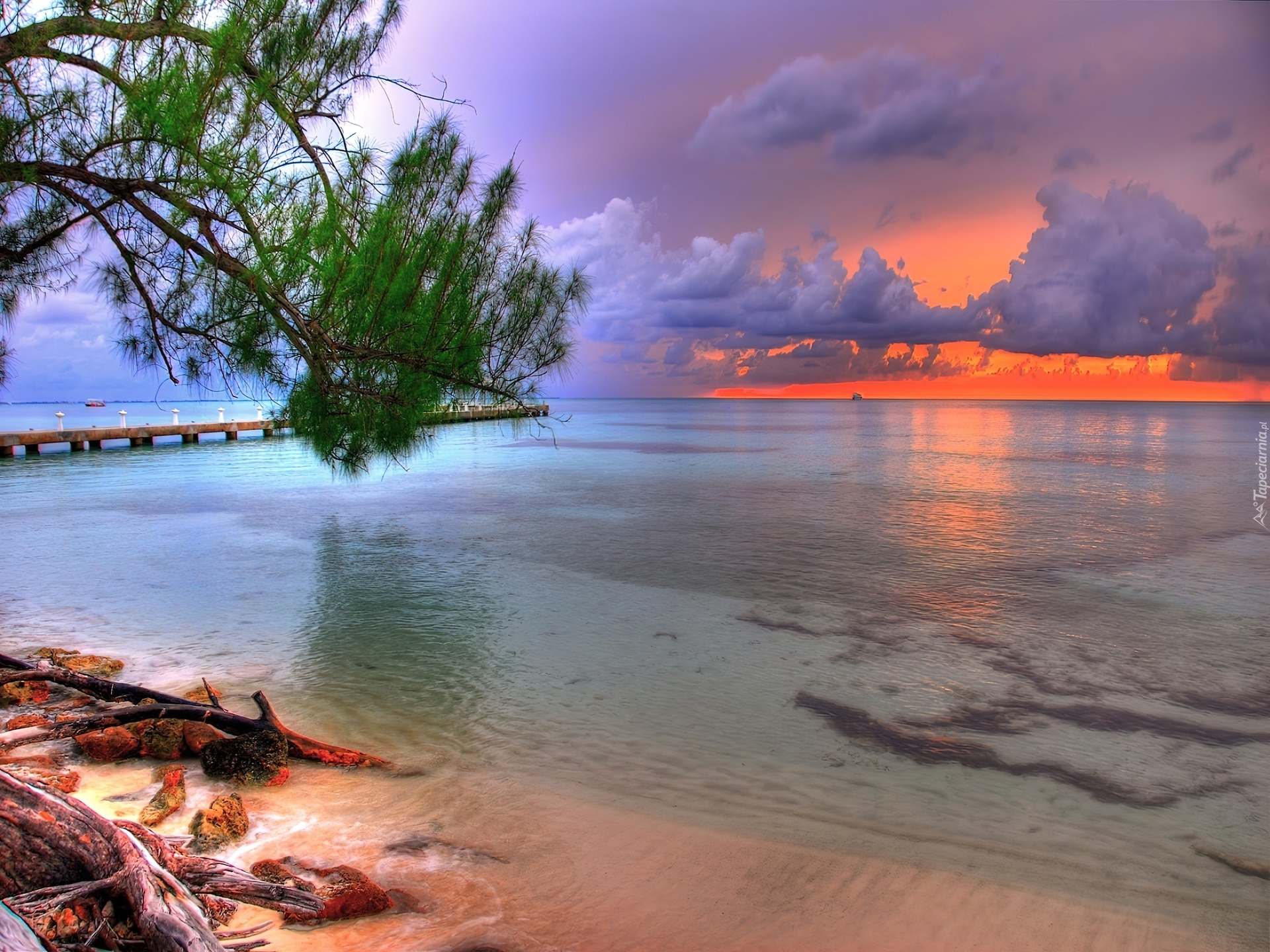 Edytor tapety: Zachód, Słońca, Morze, Molo, Plaża, Sosna