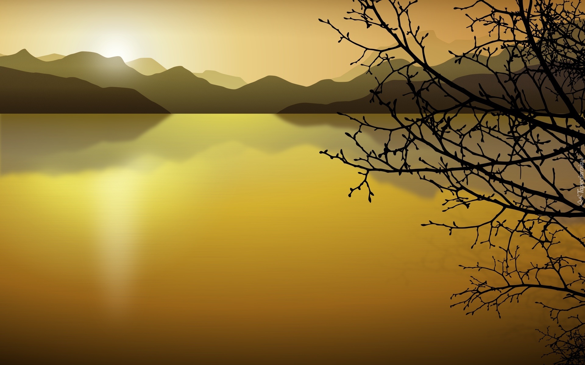 Edytor tapety: Jezioro, Blask, Gałęzie, Złoto