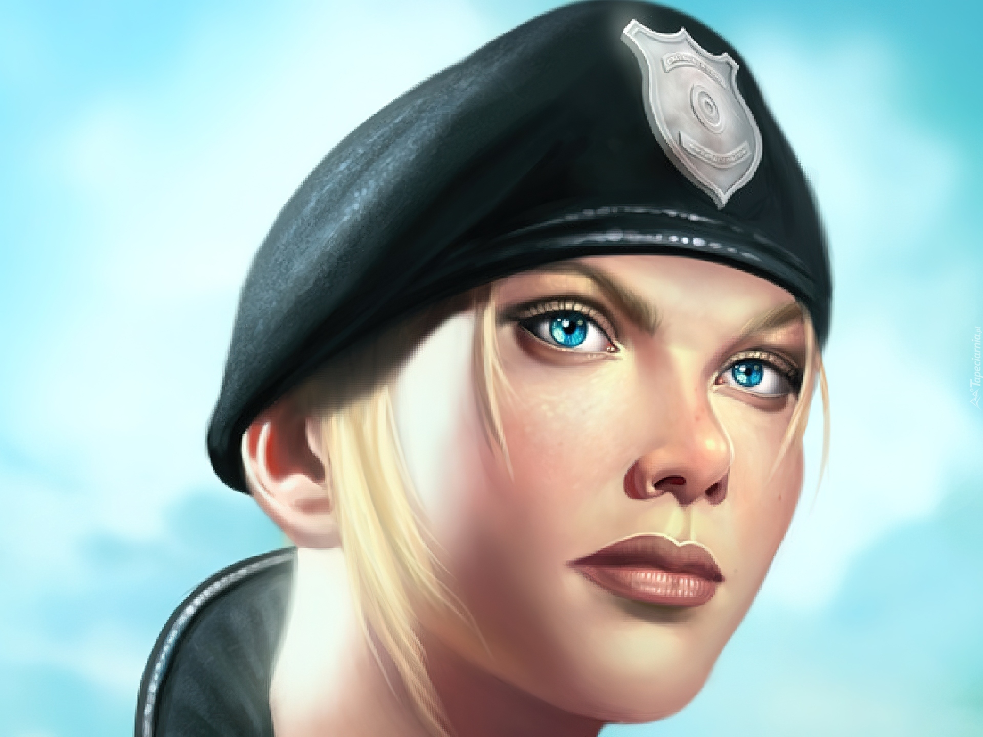 Edytor tapety: Kobieta, Beret, Niebieskie, Oczy