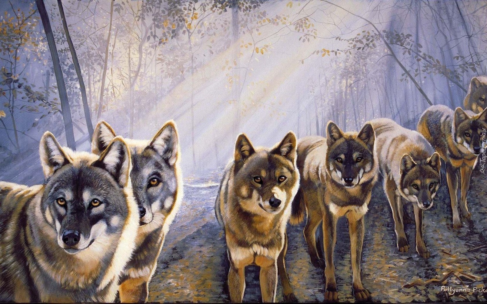Edytor tapety: Wilki, Las, Promienie, Słońca