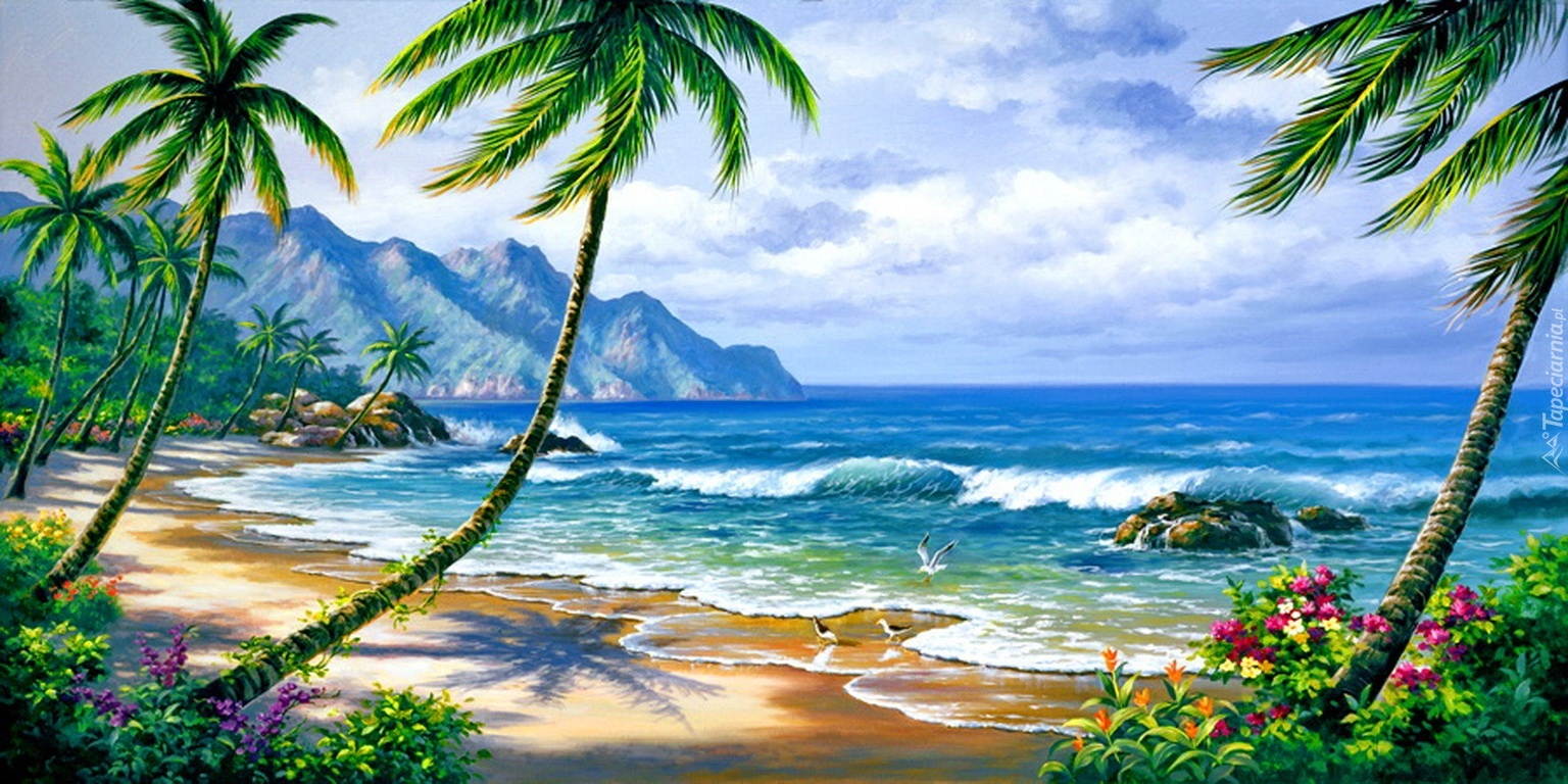 Edytor tapety: Morze, Plaża, Góry, Palmy