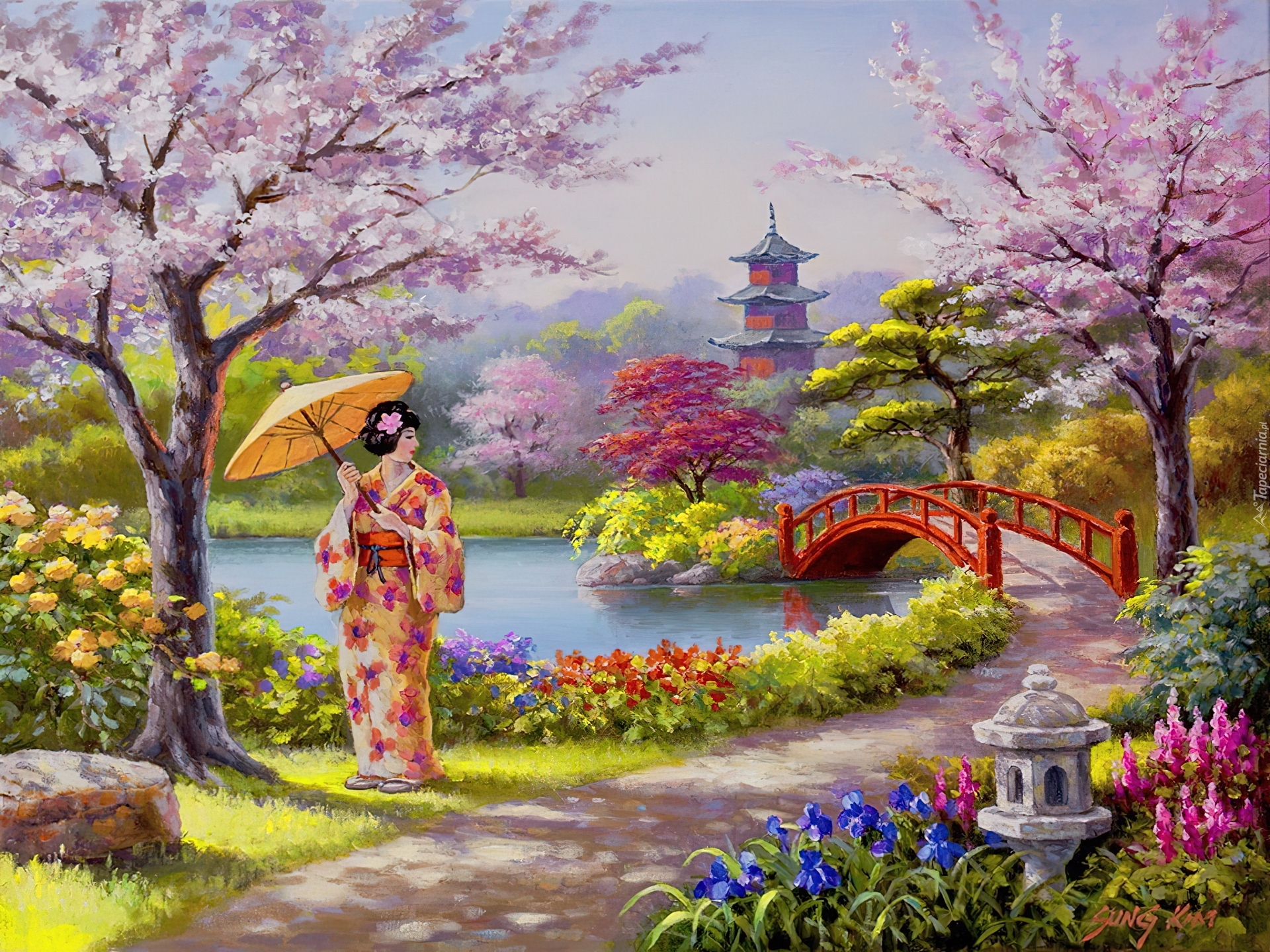 Edytor tapety: Ogród, Japonka, Kobieta, Rzeka, Most, Kwiaty