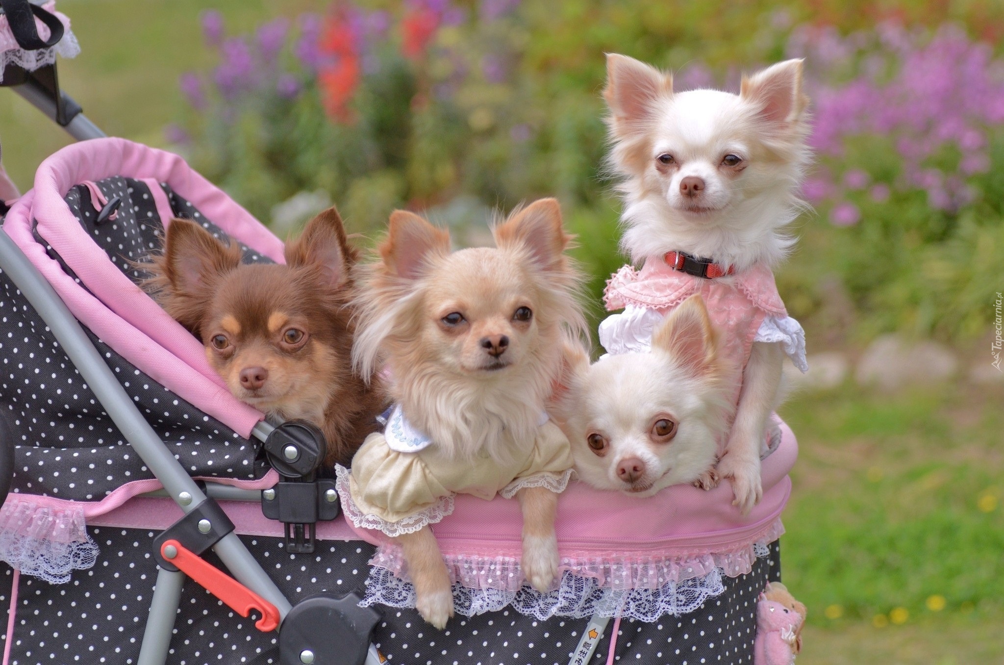 Edytor tapety: Cztery, Pieski, Chihuahua, Wózek