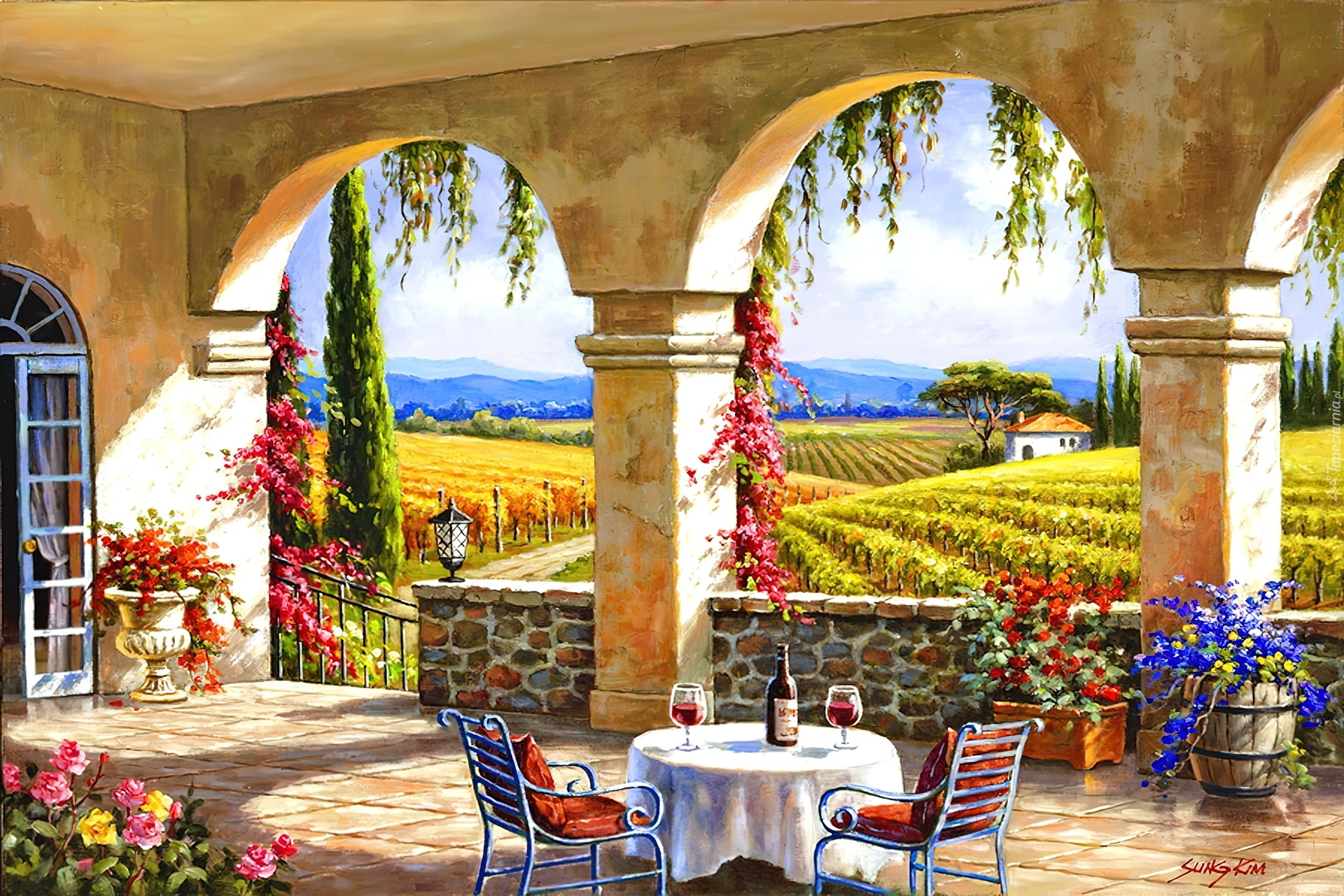 Edytor tapety: Dom, Weranda, Stolik, Krzesła, Widok, Winnice, Kwiaty
