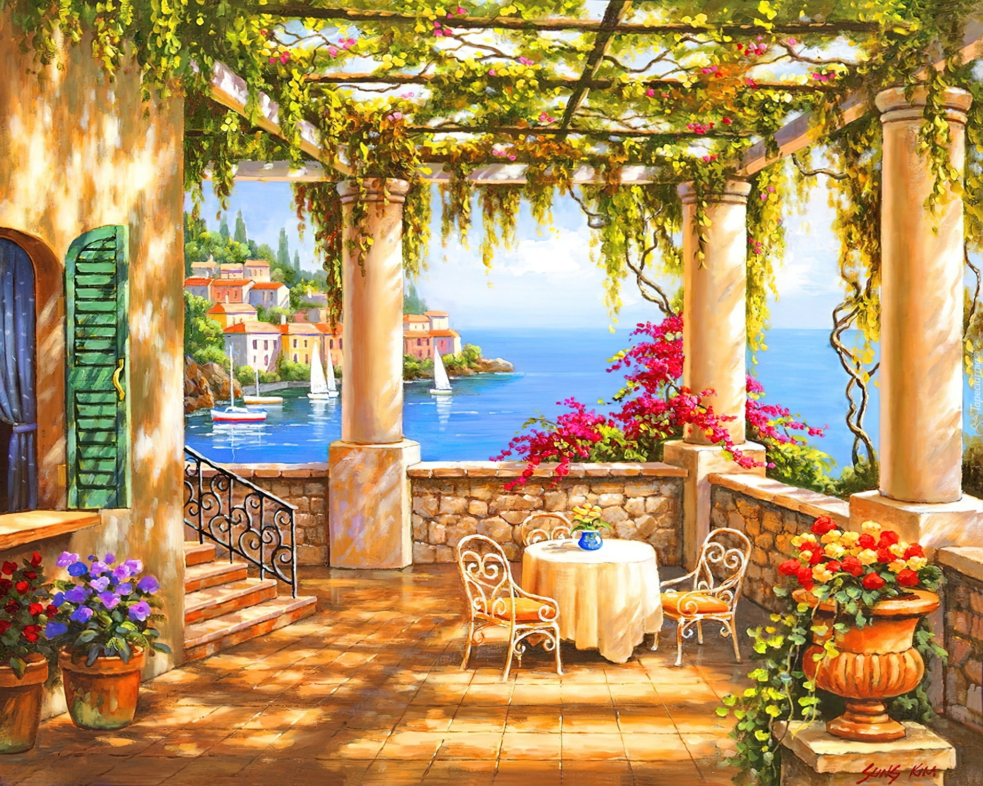 Edytor tapety: Domy, Taras, Kwiaty, Widok, Morze