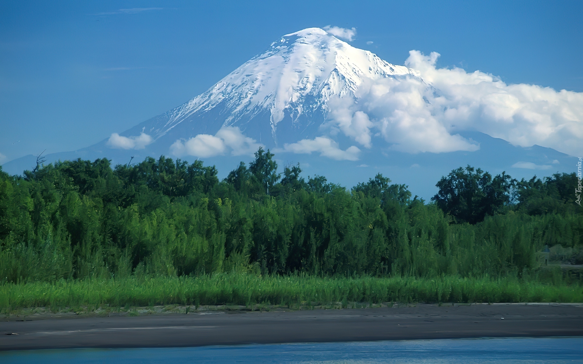 Edytor tapety: Kamczatka, Wulkan, Las, Woda