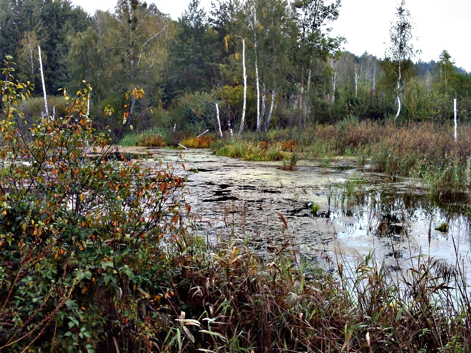 Edytor tapety: Las, Rzeka, Brzozy, Krzewy