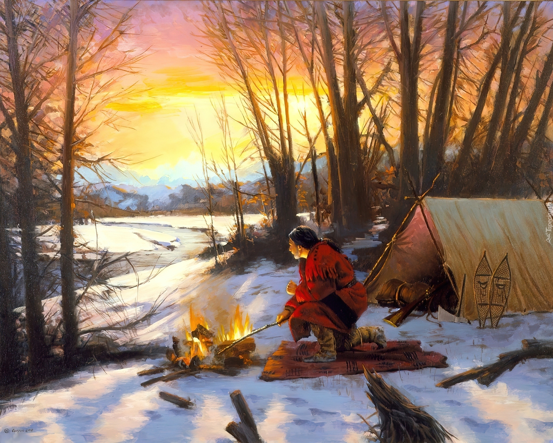 Edytor tapety: Mężczyzna, Traper, Ognisko, Namiot, Zima, Zachód, Słońca