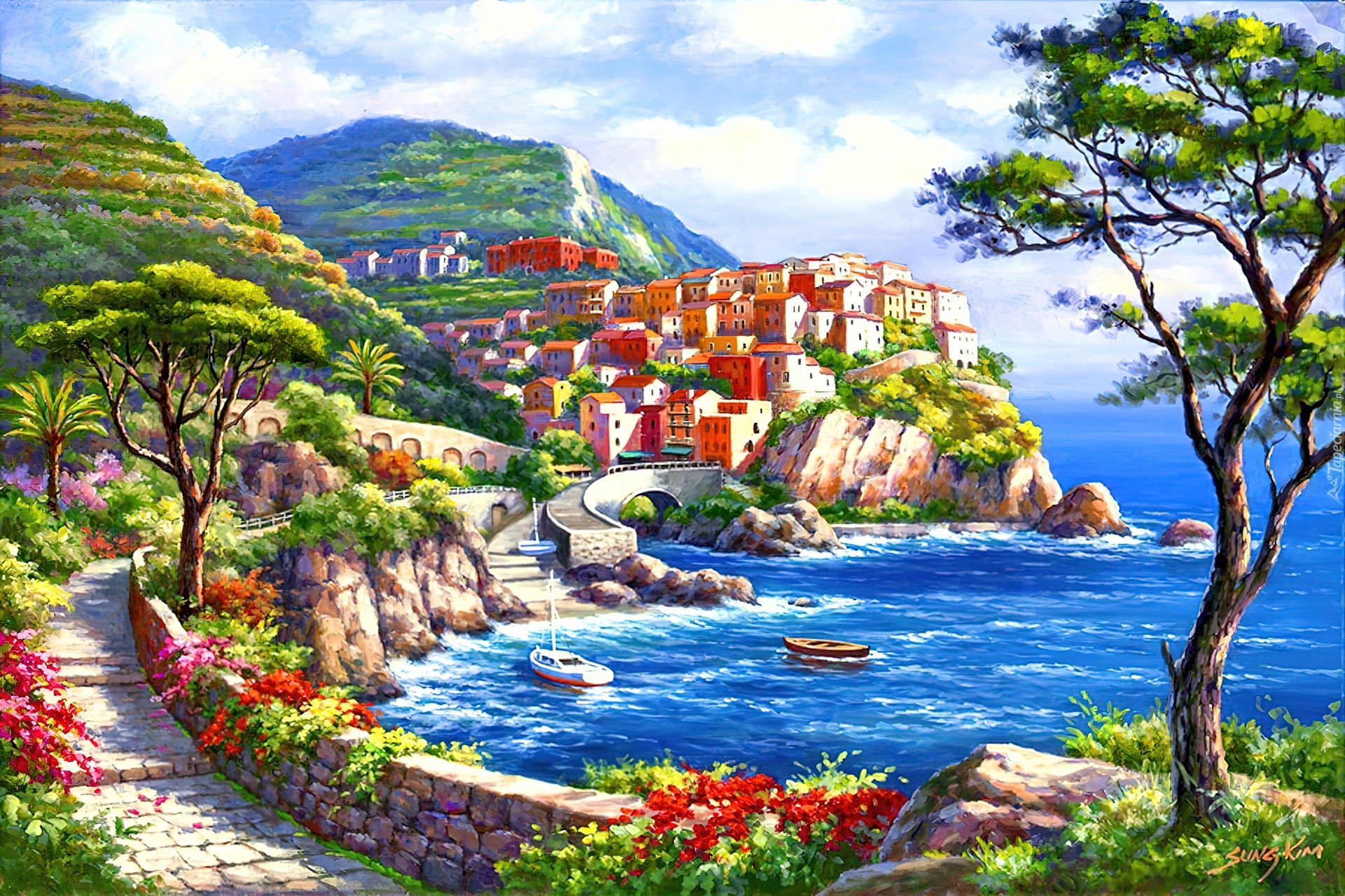 Edytor tapety: Morze, Wybrzeże, Góry, Domy, Kwiaty
