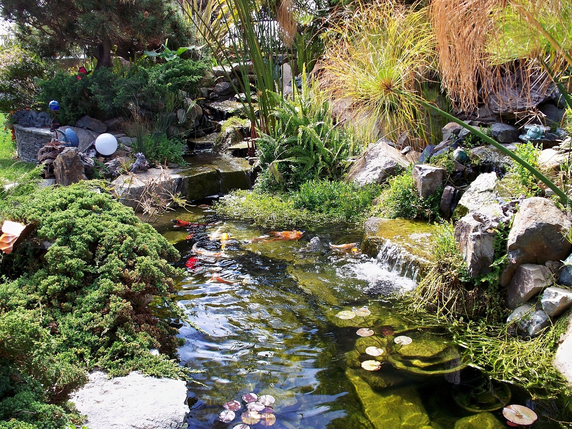 Edytor tapety: Ogród, Skalniak, Kaskada, Ryby