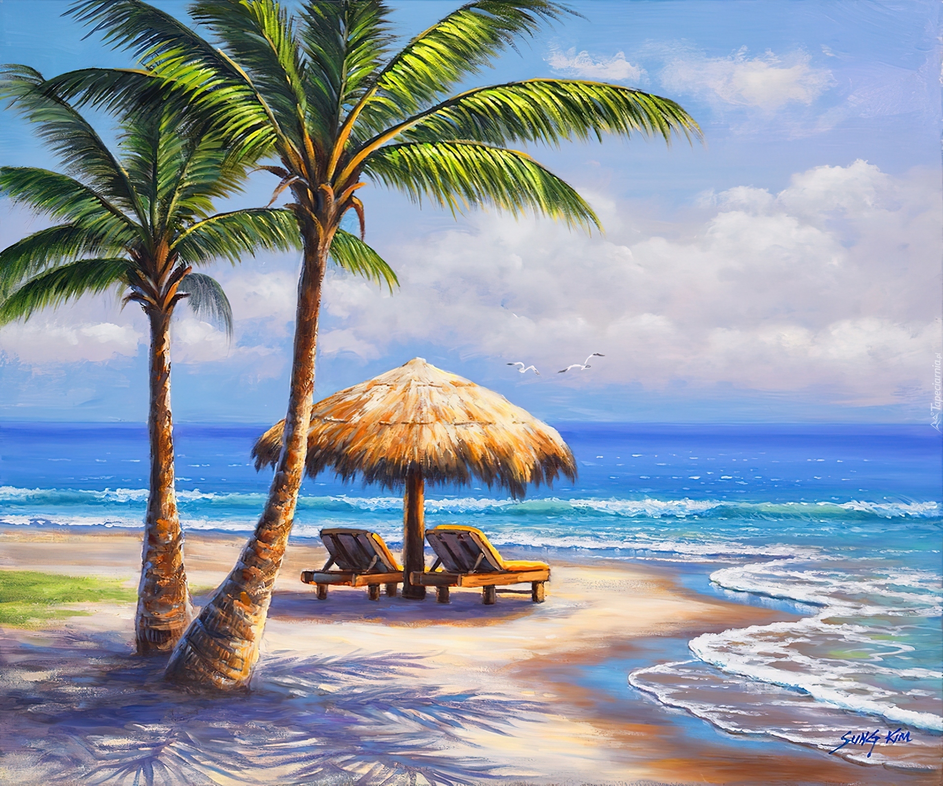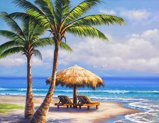 Edytor tapety: Morze, Plaża, Palmy, Parasol, Leżaki
