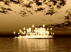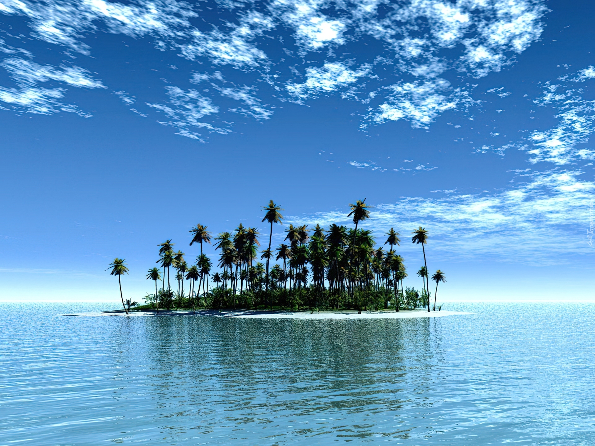 Edytor tapety: Świt, Morze, Wysepka, Palmy