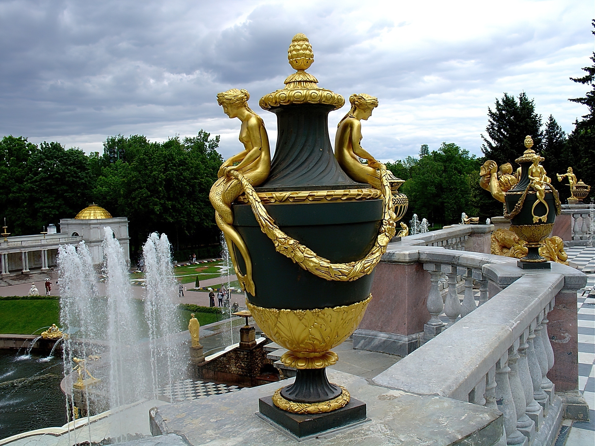 Edytor tapety: Fontanna, Pałacowy, Taras, Złote, Rzezby, St. Petersburg, Rosja