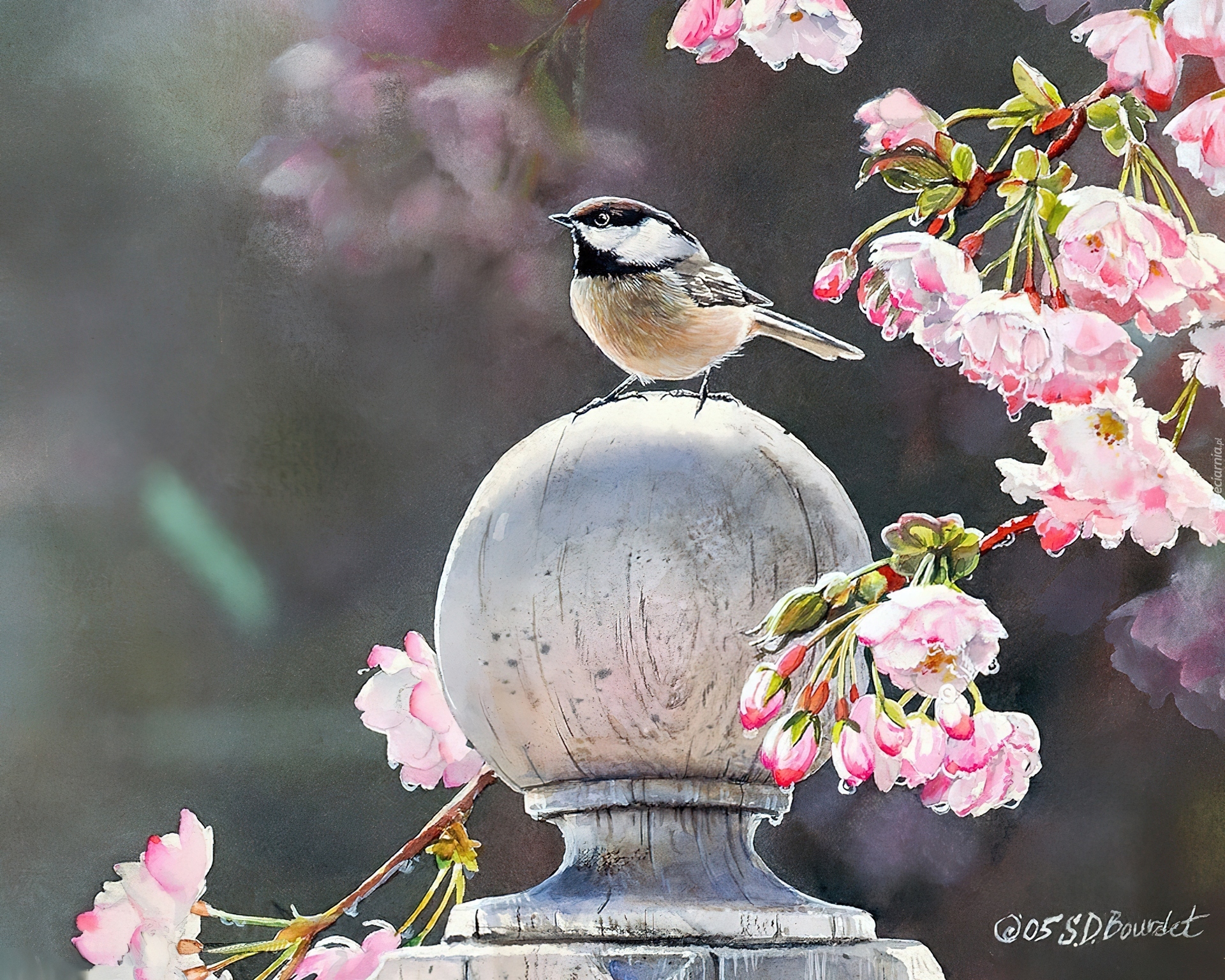 Edytor tapety: Ptak, Gałązka, Kwiaty