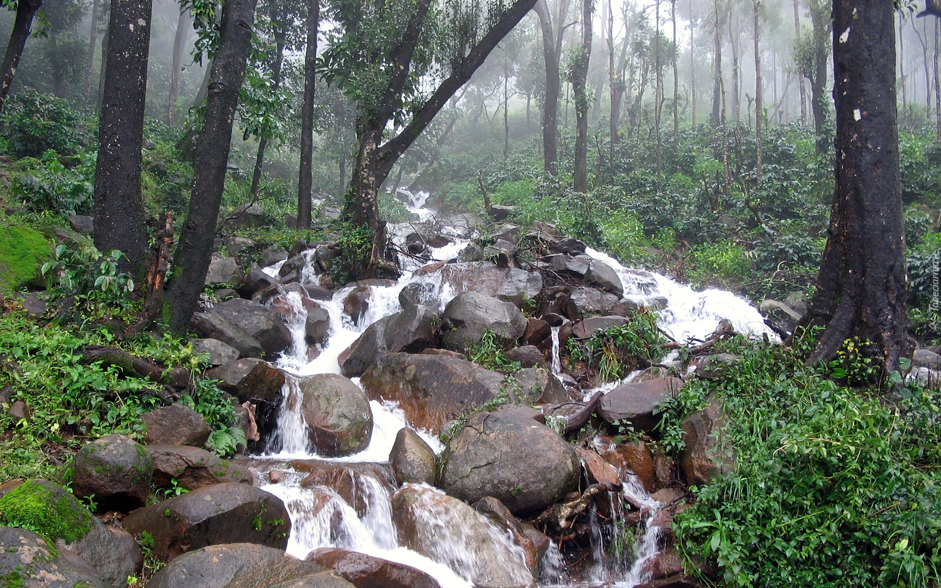 Edytor tapety: Las, Strumyk, Głazy, Mgła