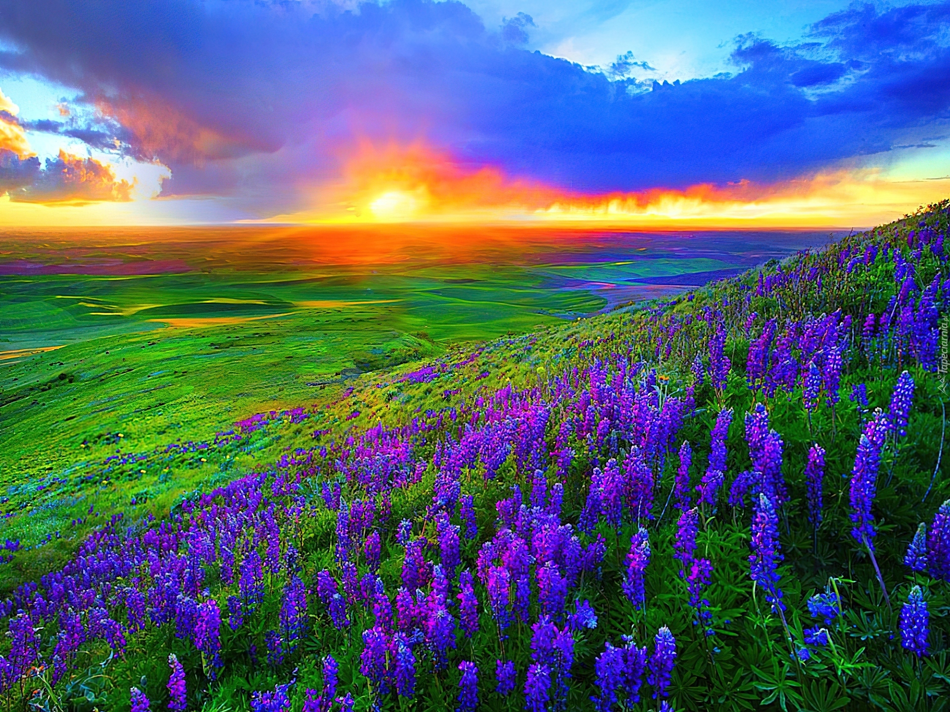 Edytor tapety: Łąka, Łubin, Zachód, Słońca