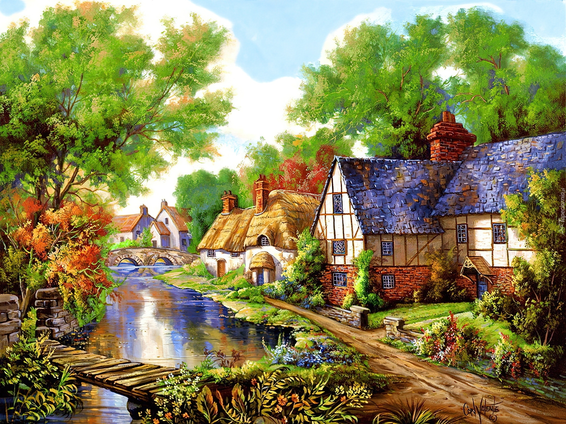 Edytor tapety: Drewniany, Mostek, Rzeka, Domy, Dróżka