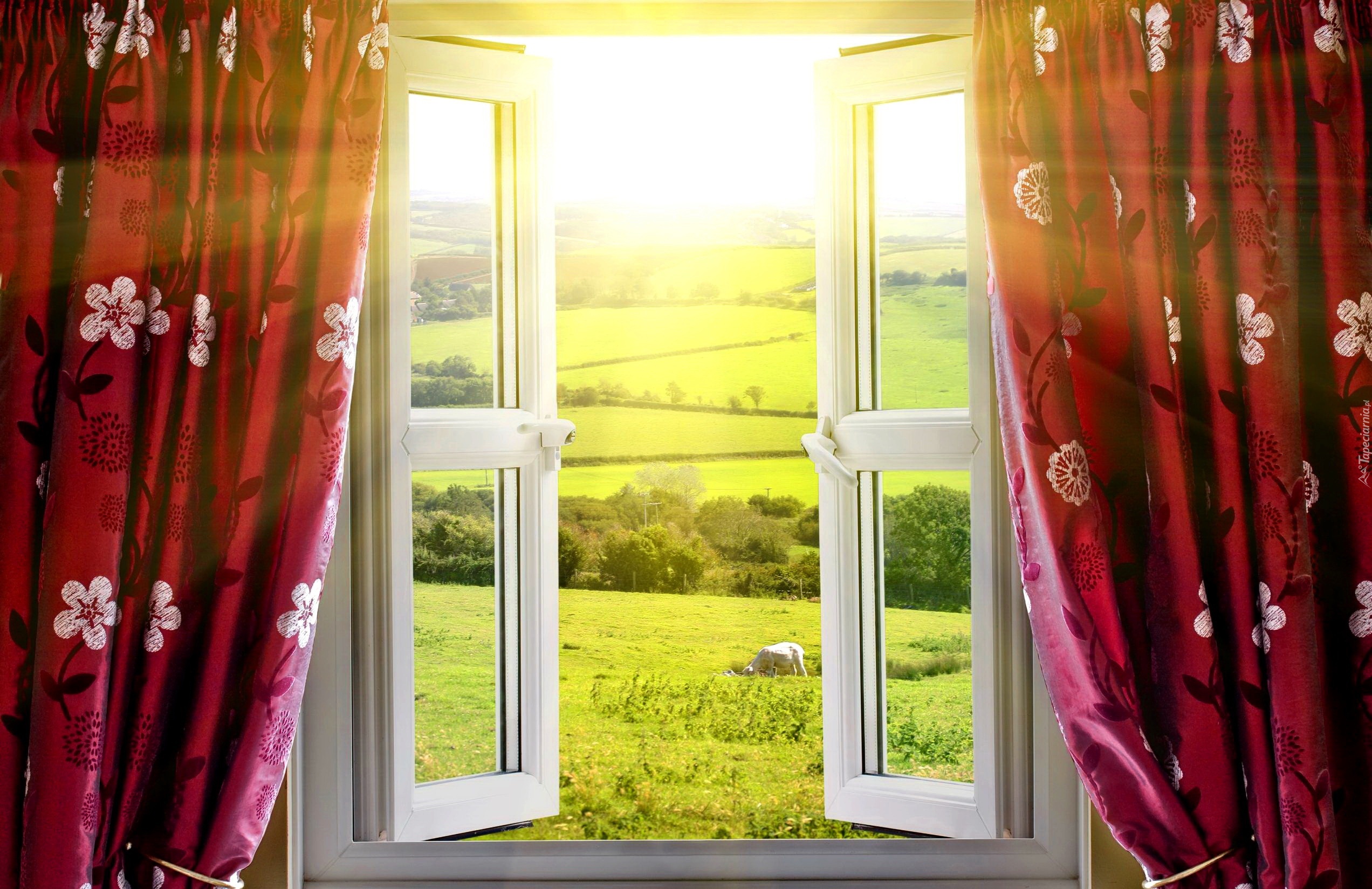 Edytor tapety: Okno, Zasłona, Widok, Pola, Łąki, Wiosna