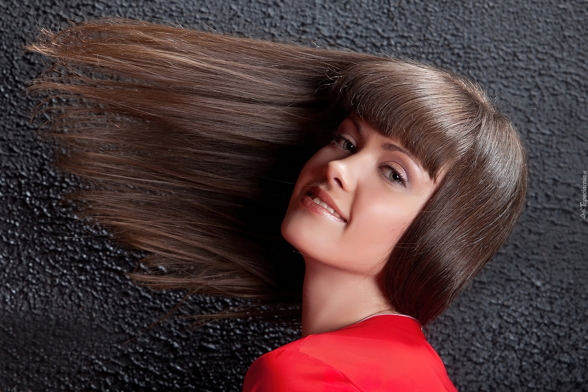 Edytor tapety: Szatynka, Rozwiane, Włosy, Czerwona, Bluzka, Makijaż