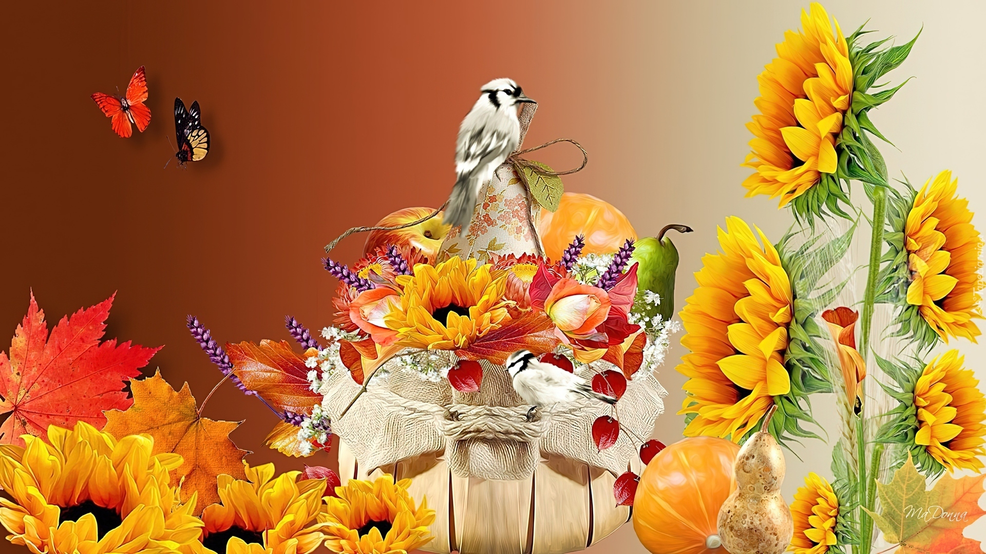 Edytor tapety: Słoneczniki, Motyle, Art