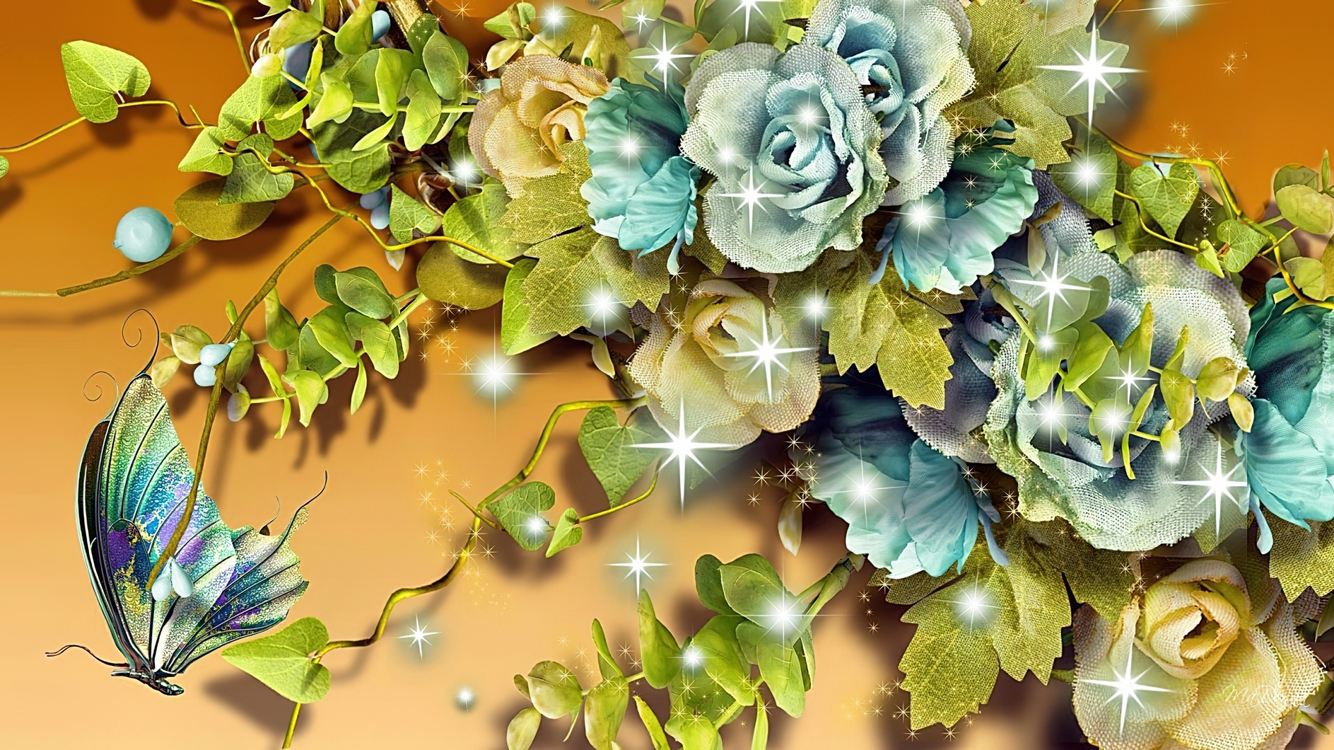 Edytor tapety: Niebieskie, Róże, Motyl, Art
