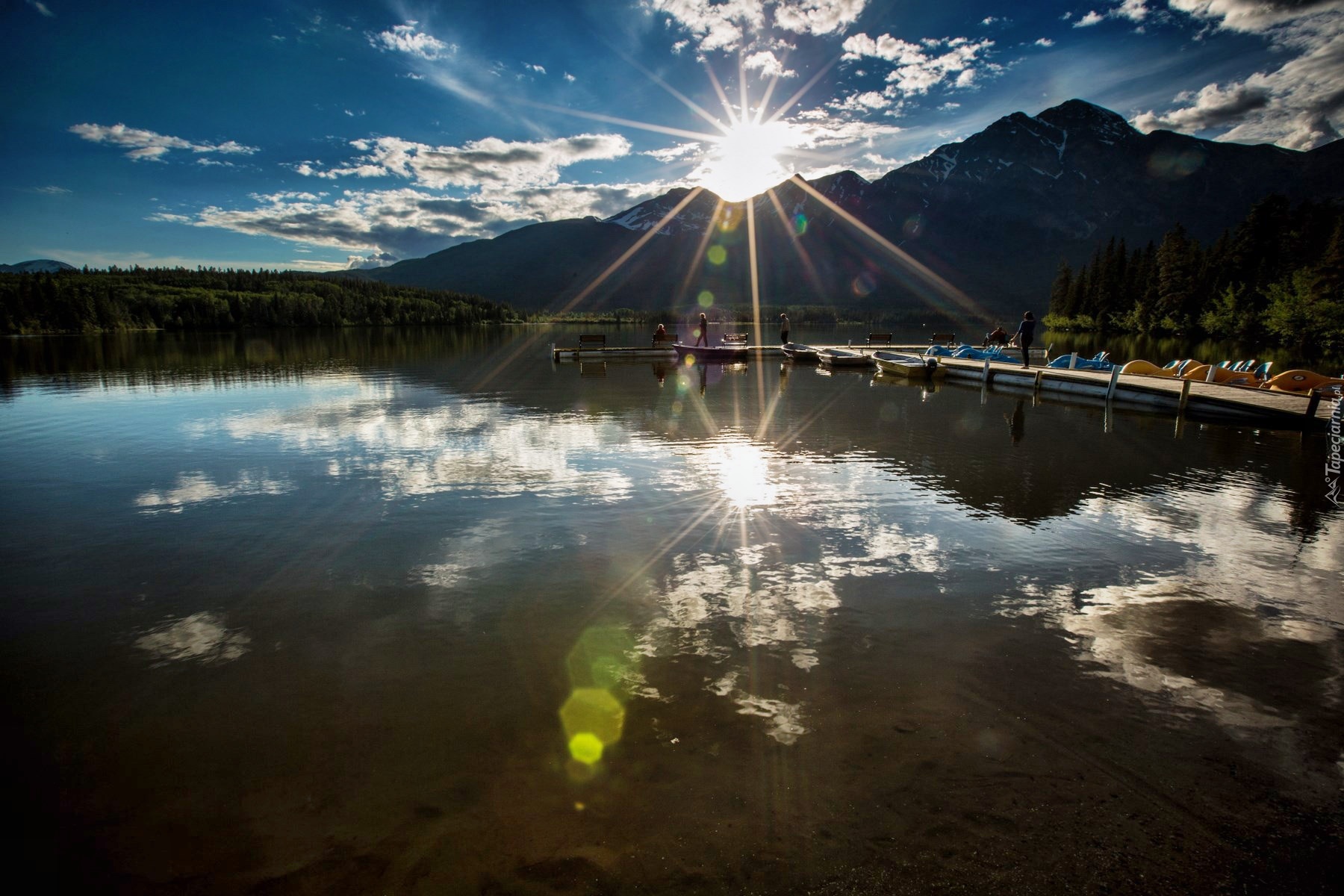 Edytor tapety: Jezioro, Pomost, Góry, Wschód, Słońca
