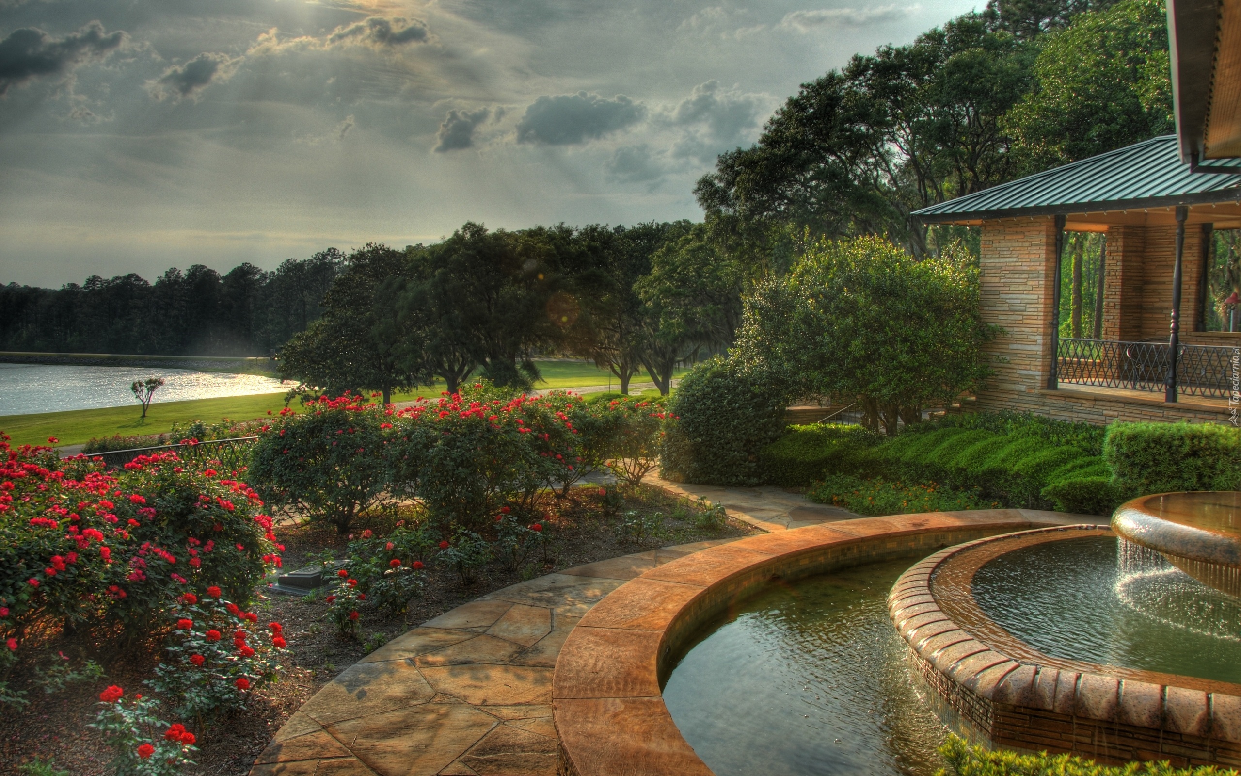 Edytor tapety: Fontanna, Dom, Ogród