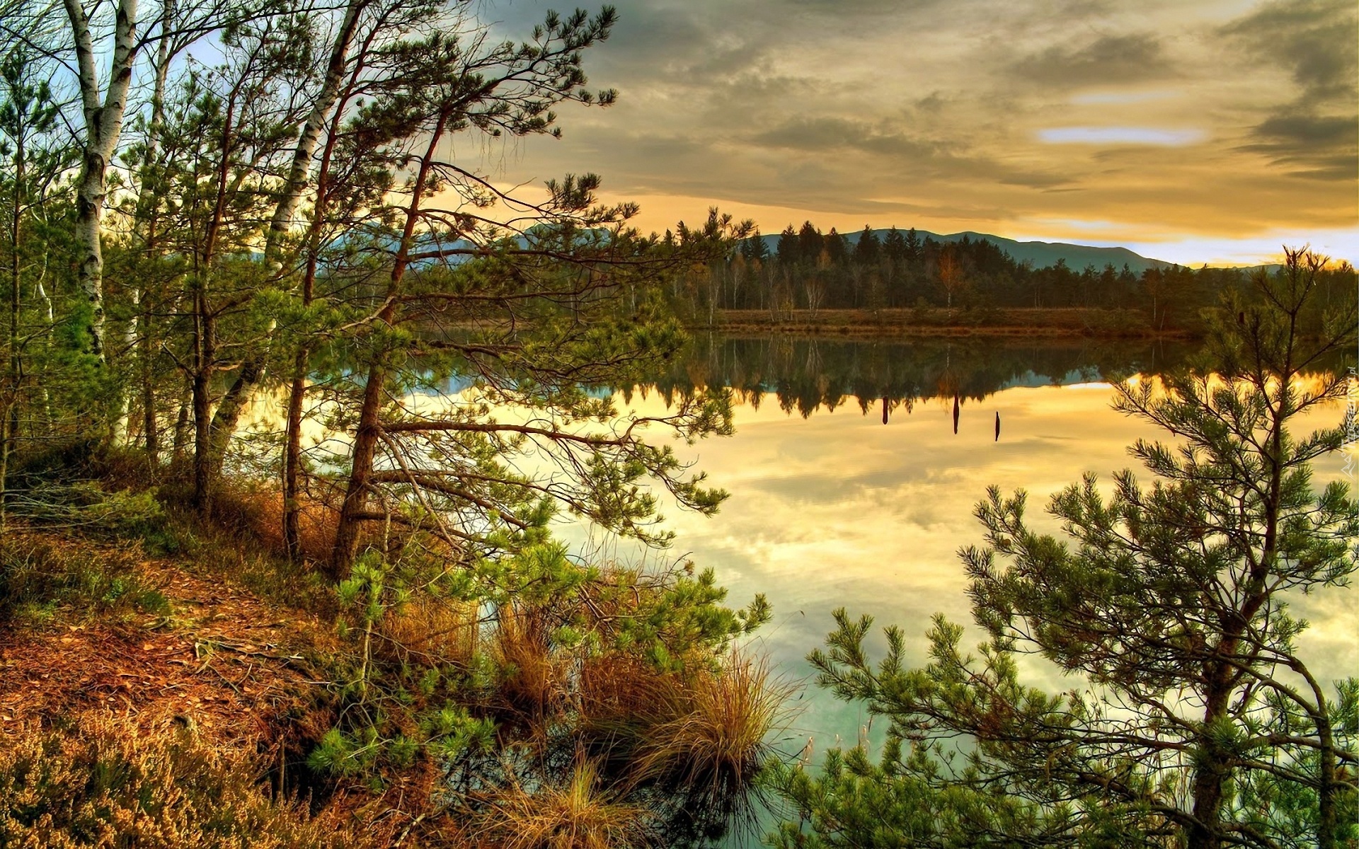 Edytor tapety: Zachód, Słońca, Jezioro, Las