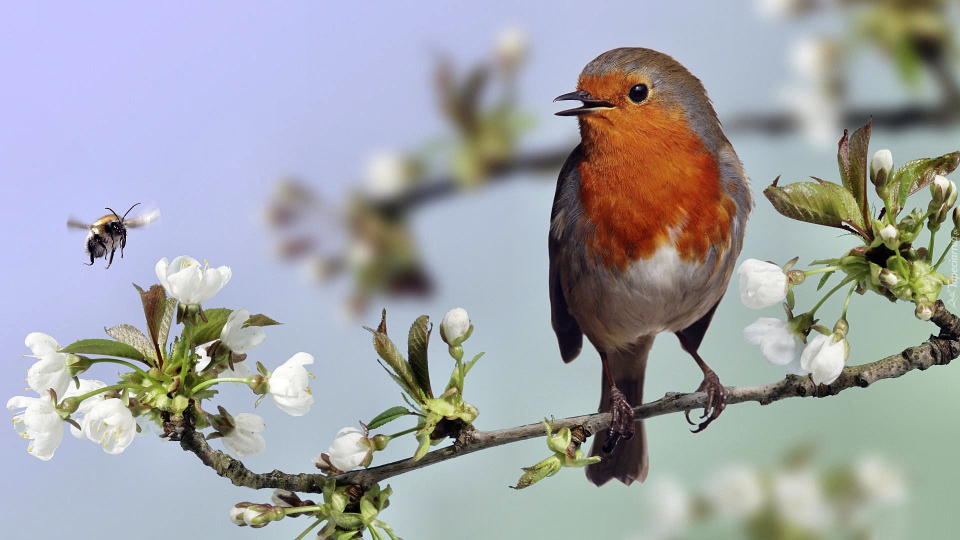 Edytor tapety: Ptak, Rudzik, Kwitnąca, Gałązka