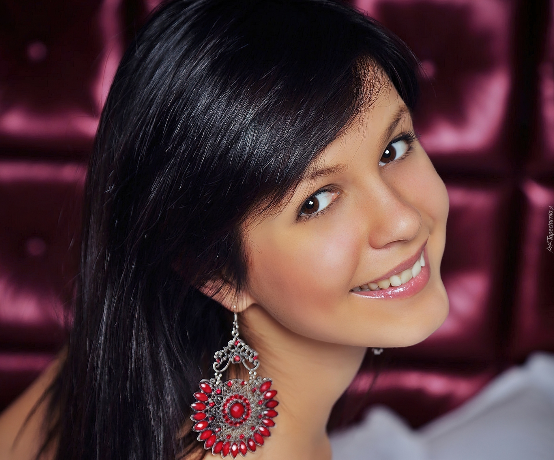 Edytor tapety: Uśmiechnięta, Brunetka, Kolczyki, Makijaż