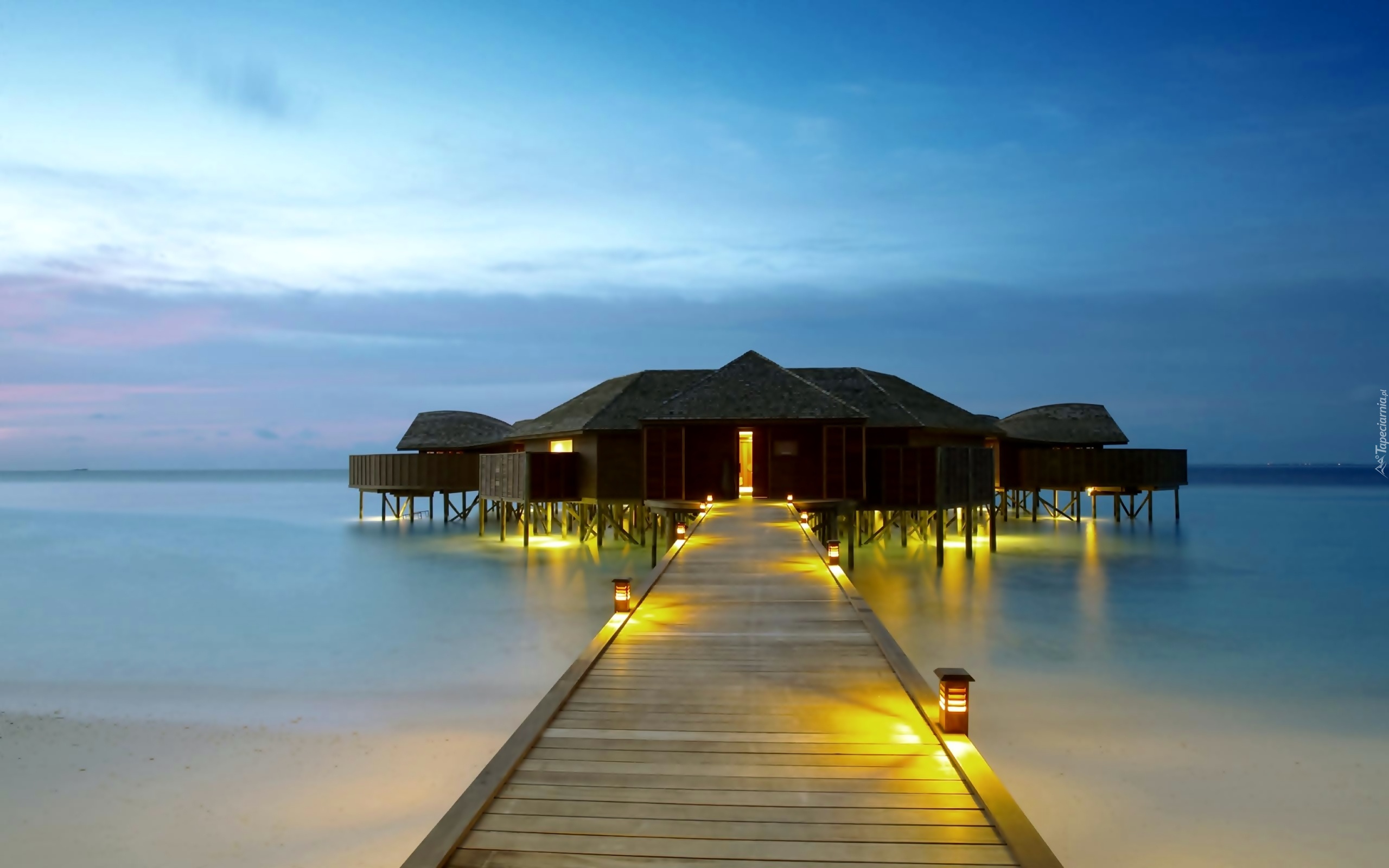 Edytor tapety: Wieczór, Laguna, Podświetlone, Molo, Domki, Na Palach