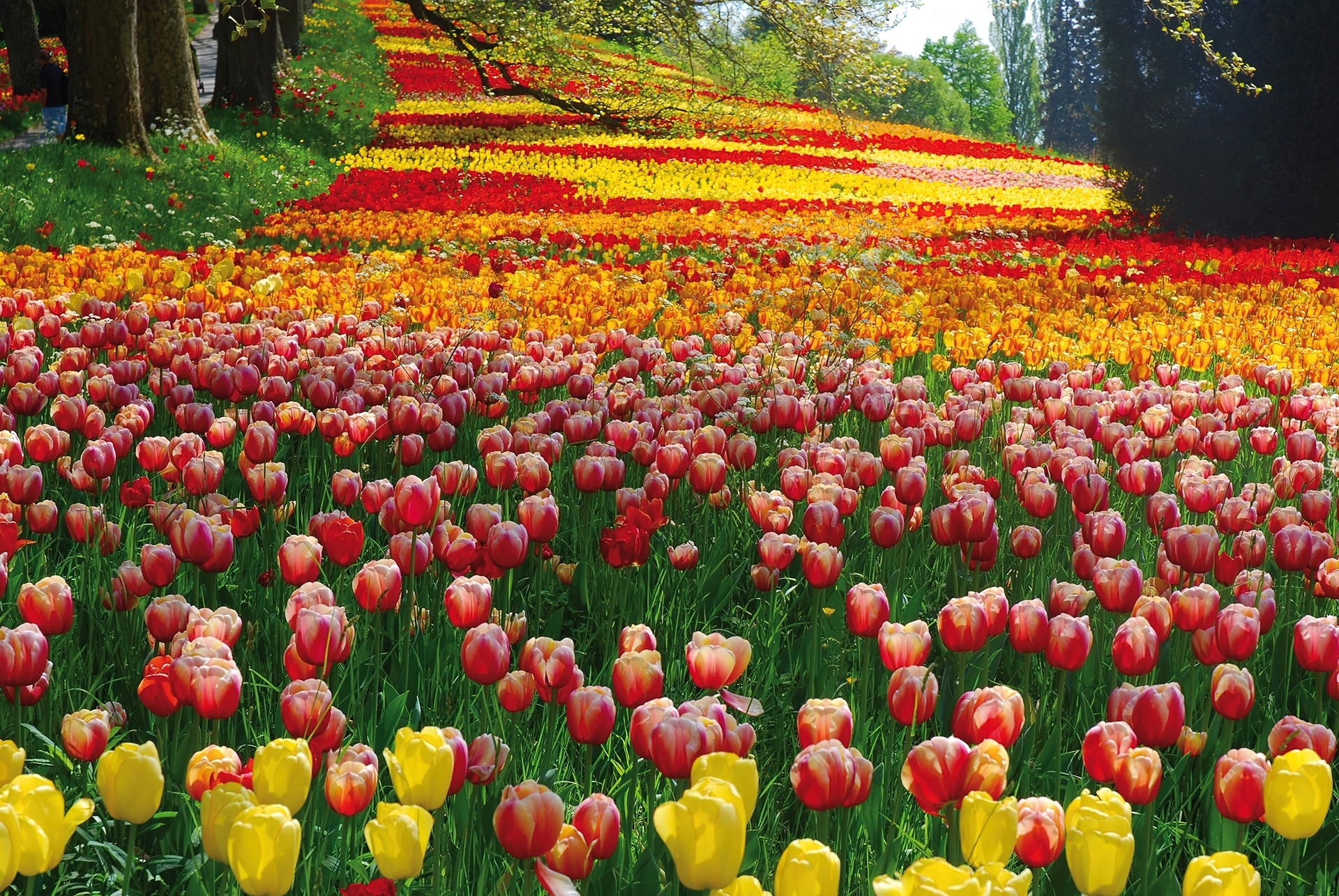 Edytor tapety: Kolorowe, Tulipany, Drzewa, Alejka
